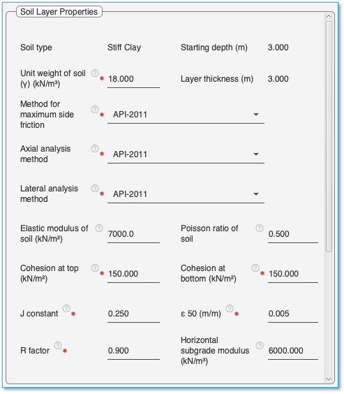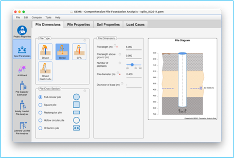 Input parameters pane specifies the dimensions, properties of the pile, soil, and load cases. These are entered in their respective tabs.