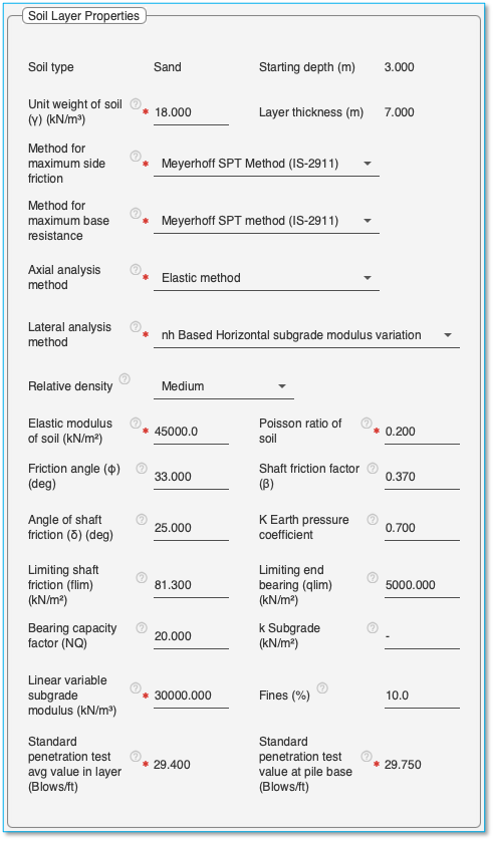 For sand layers, the 'standard penetration test avg value in layer' is calculated by averaging the values in the layer and displayed in the soil layer tab in the ' Soil Layer Properties ' pane. This value is used when the 'method for maximum side friction' is set as one of 'Meyerhoff SPT method (IS2911)'. This data is also used for lateral load analysis for sand soil layer when ‘Hybrid model for liquified sand (based on SPT)’ is selected