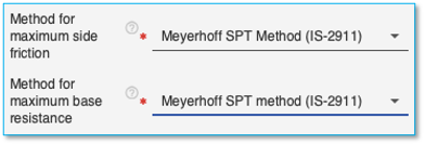 When the pile terminates in the sand layer, the 'standard penetration test value at pile base' is calculated by averaging the values from pile tip – 2D and pile tip + 3D and displayed in the soil layer tab in the 'Soil Layer Properties' pane (D is the effective Diameter of the pile). This value is used when one of 'Meyerhoff SPT method (IS2911)' is selected as the ' method for maximum base resistance '.